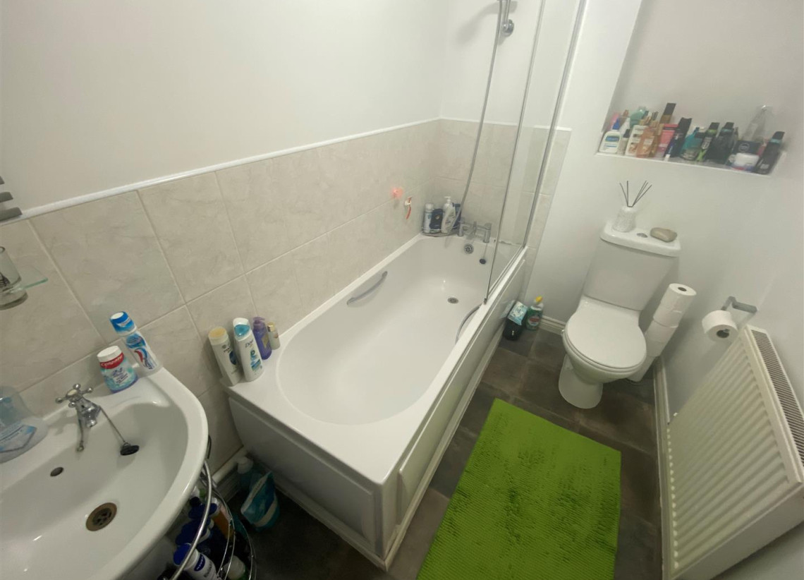 Bathroom - 2.42m x 1.4m (7'11" x 4'7") - Part tiled bathroom with white suite to include bath and shower, w/c and wash hand basin.